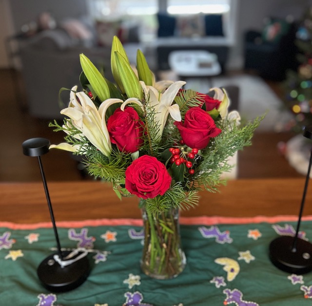 My husband loves arranging flowers and other plants from our gardens throughout the growing season. He has inspired me to make my own small holiday arrangements to gift to friends and colleagues. With winter in full swing here in Chicagoland, I’m able to find the materials I need, like pine boughs, berries, and red and white flowers, at my local grocery store to form into arrangement that I can put in a small Mason jar to share with others.